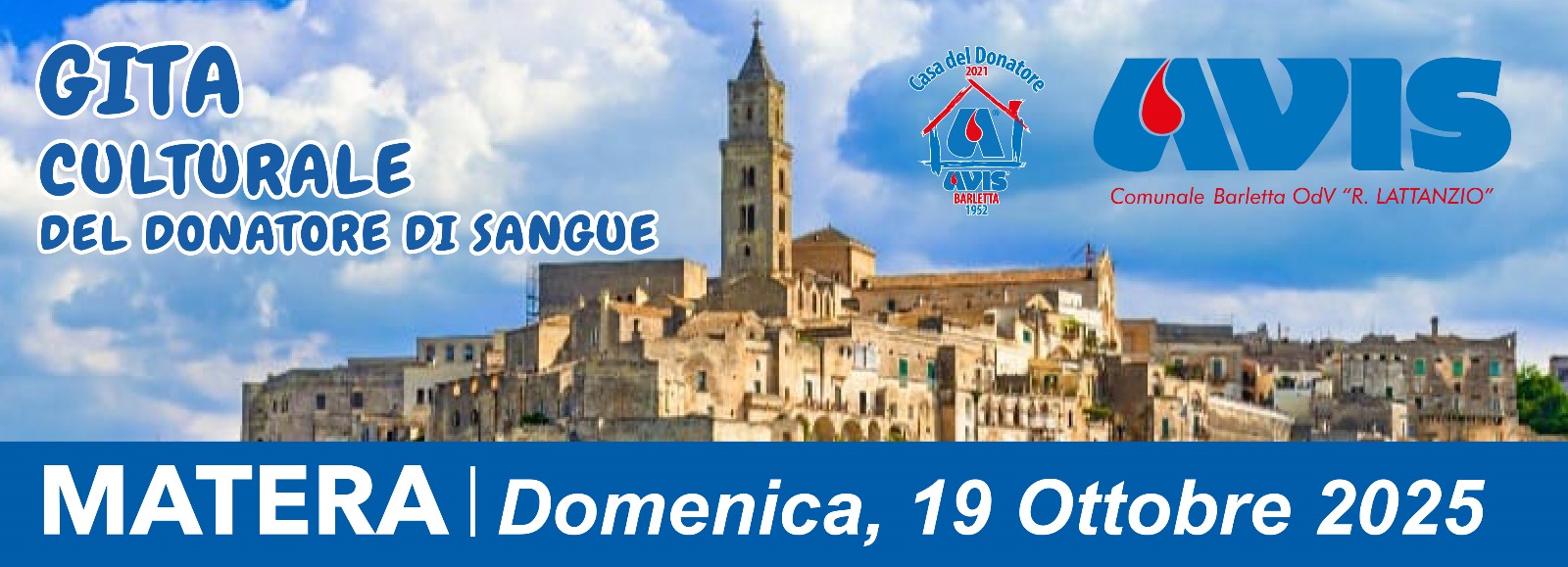 Gita culturale Matera 2025 banner FBbanner 73 anni AVIS5xmille slide mano AVIS Barlettaattività socialiZio Sam 6X3